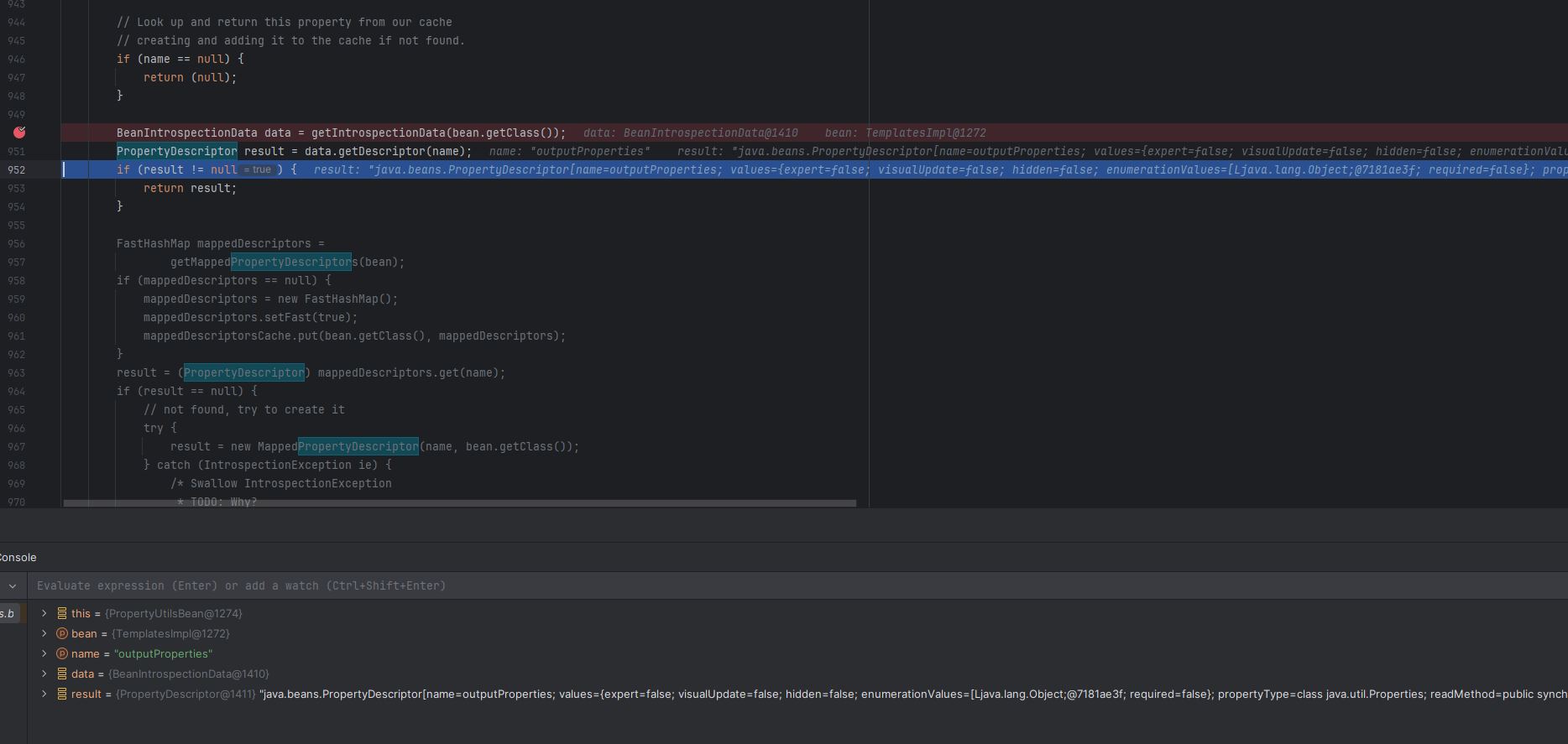 Which further calls getNestedProperty(). Since we do not have any nested property (which would look something like a.b.c instead of outputProperties), getSimpleProperty() gets called.