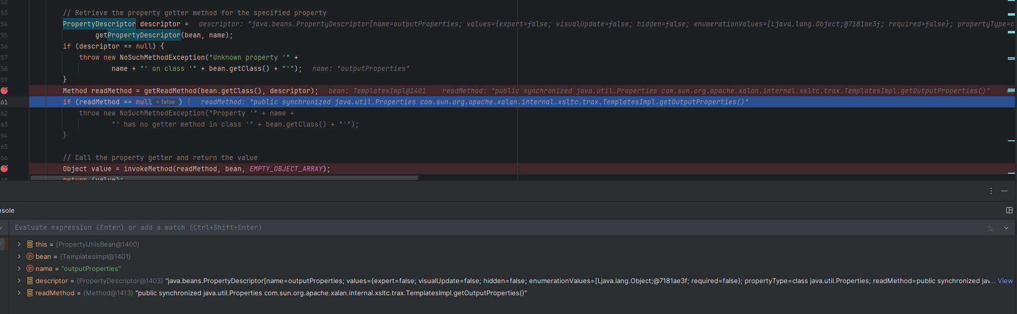 This function, defined as below, calls PropertyUtilsBean.getProperty() with TemplatesImpl as the bean name and "outputProperties" as the name: